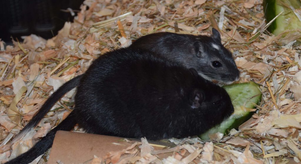 Der hübsche zutrauliche Panther hat einige Gramm zuviel auf den Rippen, trainiert aber fleißig im Laufrad. Sein neuer kleiner noch schüchterner Freund tut sein übriges.